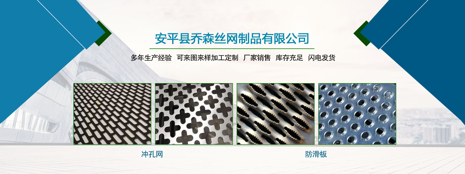 安平縣喬森絲網制品有限公司主營產品:篩網、金屬裝飾網、沖孔網板、防滑板和軋花網。常年現貨供應45號黑鋼絲編織篩網、熱鍍鋅鋼絲篩網、304不銹鋼篩網和冷鍍鋅鐵絲網,加工定做耐磨65號錳鋼絲篩網、菱形孔防堵篩網、養殖用長方孔鐵絲網、金屬裝飾網、盤條 礦篩網等各種鋼絲篩網和建筑用鐵絲網片,歡迎新老客戶前來咨詢洽談合作。